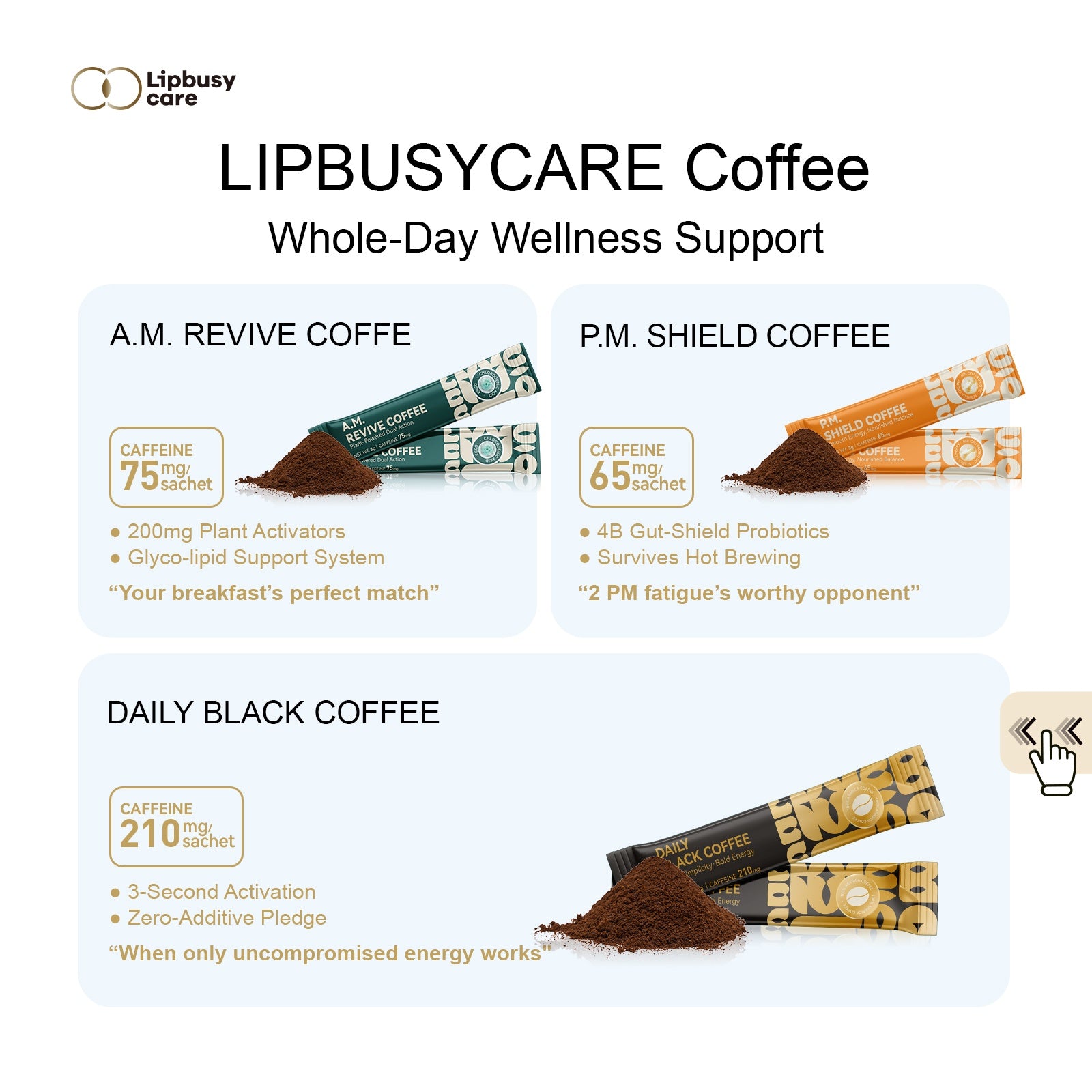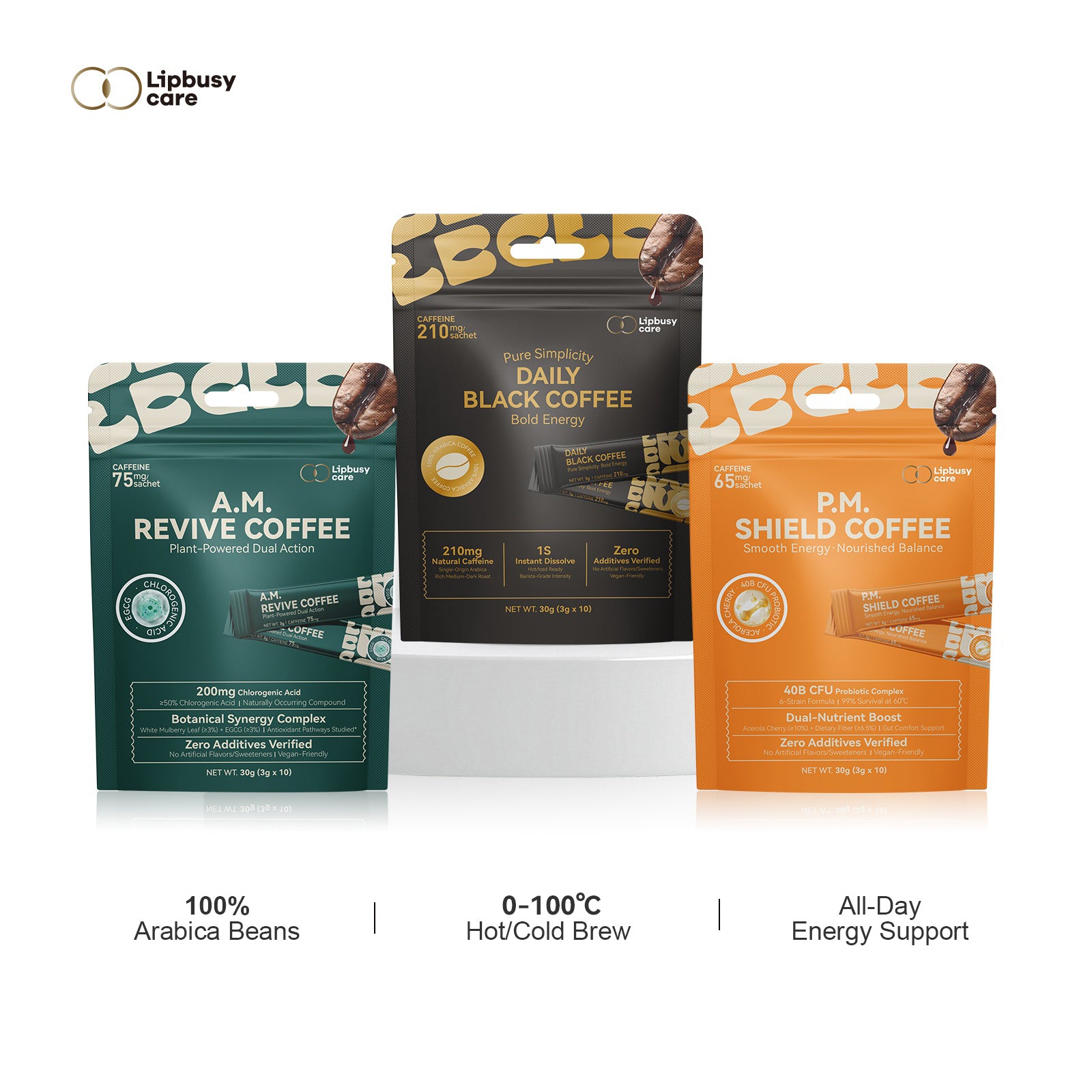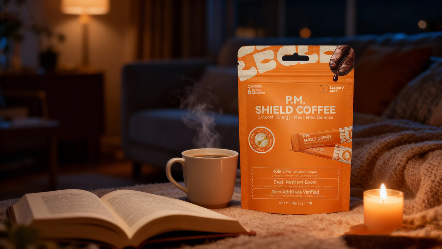 P.M. SHIELD COFFEE closes the loop — probiotics guard your gut, vitamin C shields your cells, and a gentle roast keeps the night kind. Energy without anxiety, comfort without compromise.