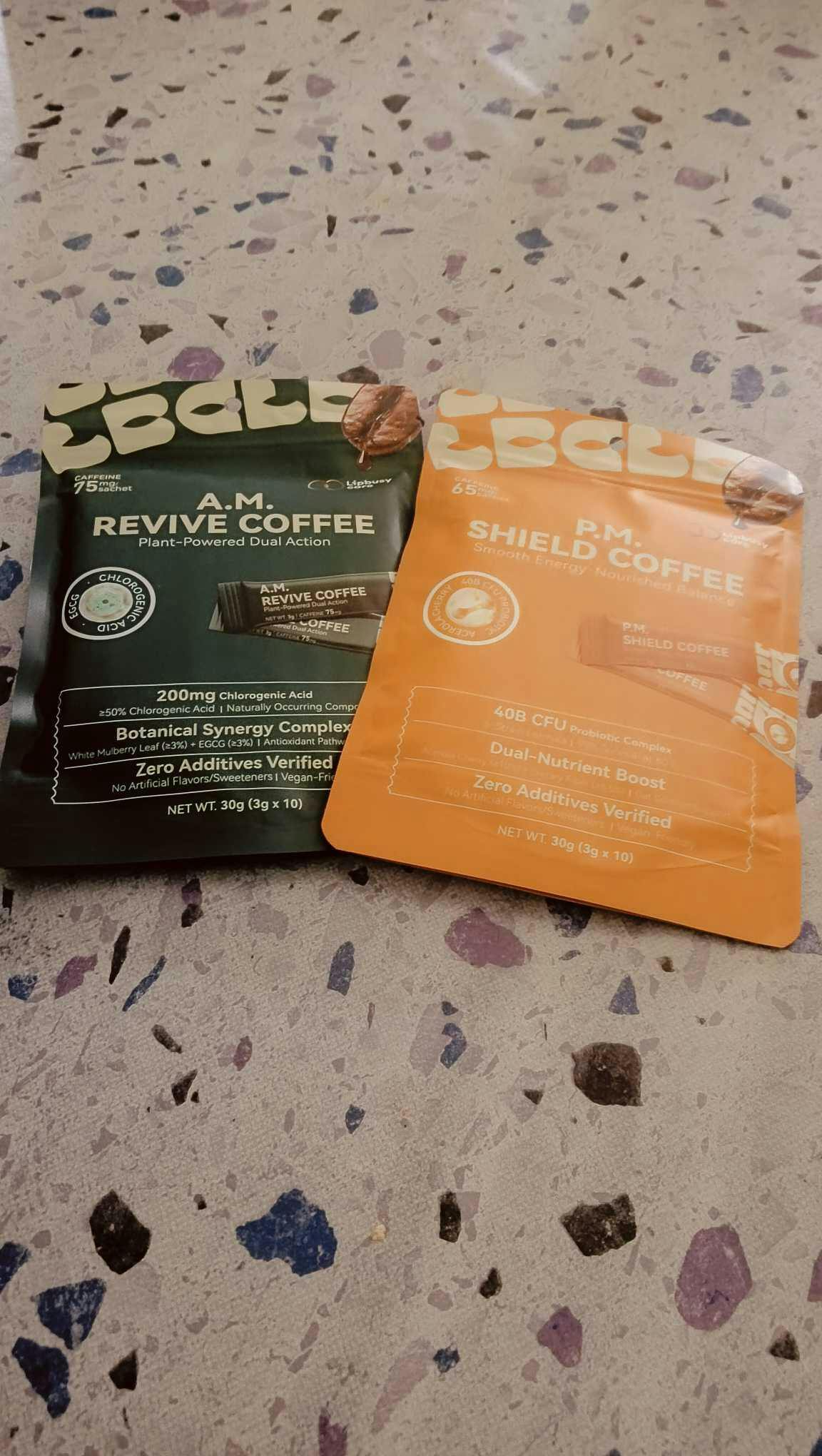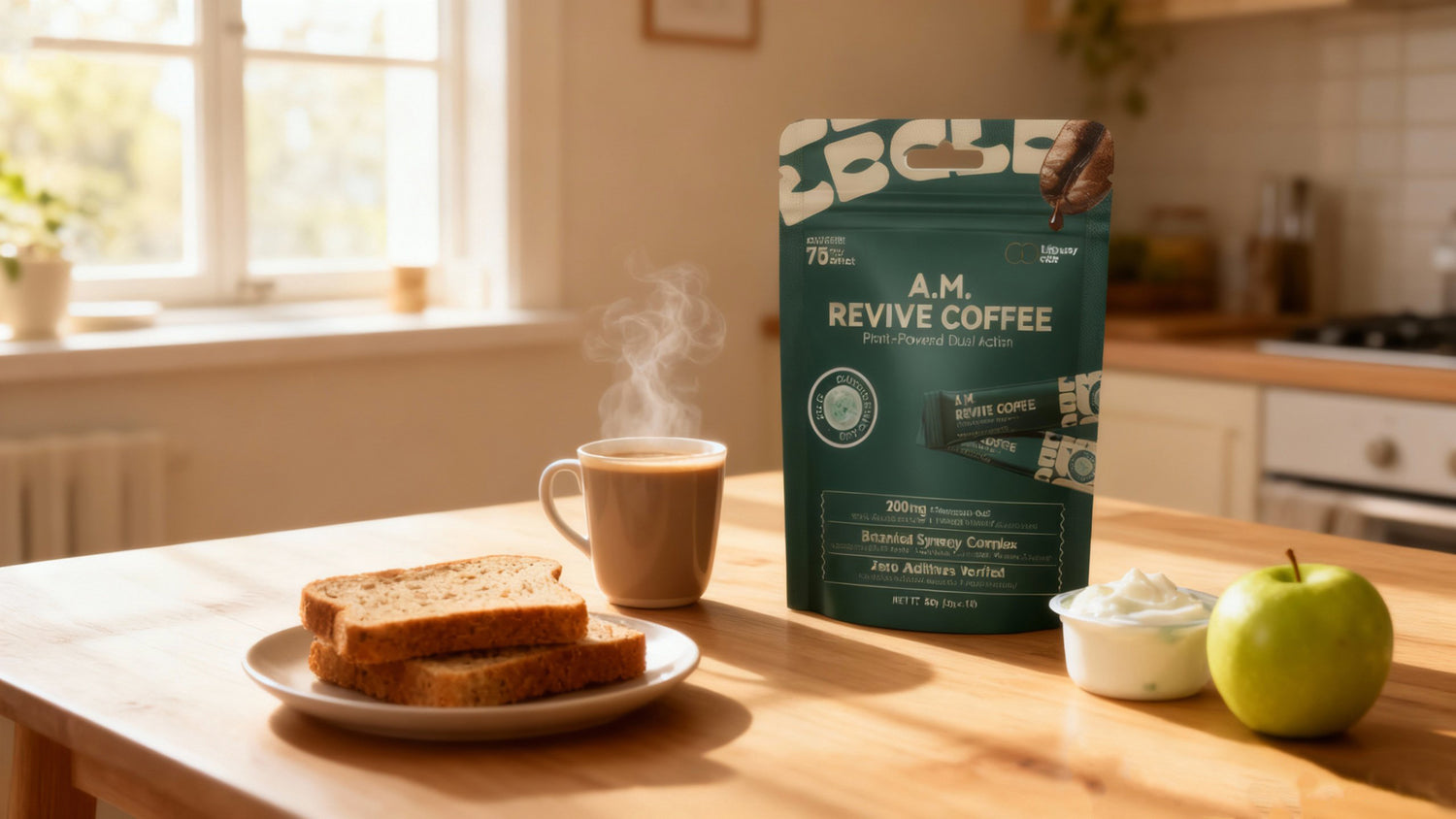 A.M. REVIVE COFFEE wakes you with intention — rich in chlorogenic acid and EGCG, it’s not just caffeine, it’s clarity. A calm metabolism meets the spark of morning.